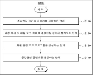 - 요약 본 발명에 따른 증강현실 콘텐츠 제공 방법은 적어도 하나의 프로세서에 의하여 실행되는 손가락 재활 훈련을 위한 증강현실(AR: Augmented Reality) 콘텐츠 제공 방법에 있어서, 증강현실 공간의 좌표계를 생성하는 단계; 모델링된 객체를 이용하여 가상의 배경 객체 및 상기 배경 객체에 결합되는 적어도 하나의 재활 도구 객체를 생성하고, 상기 생성된 배경 객체 및 재활 도구 객체를 상기 증강현실 공간에 불러오는 단계; 및 상기 배경 객체 및 재활 도구 객체의 크기와, 회전, 및 배치 위치를 결정한 후 콘텐츠 DB에 저장하여 증강현실 콘텐츠를 생성하는 단계;를 포함할 수 있다.